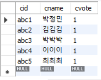 - cvote : ํฌํ ์ฐธ์ฌ์์ ํฌํ ์ ๋ฌด (์ค๋ณต ํฌํ ๋ฐฉ์ง, default๋ฅผ 0์ผ๋ก ํ๊ณ ํฌํ๋ฅผ ํ๋ฉด 1๋ก ์ ๋ฐ์ดํธ)