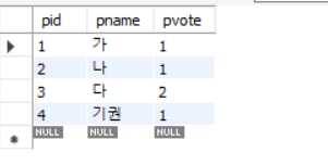 - pvote : ์ ๊ฑฐ ํ๋ณด์์ ๋ํ ์ (์ฐธ์ฌ์๊ฐ radio ๋ฒํผ์ ํตํด ํฌํ๋ฅผ ํ๋ฉด radio ๋ฒํผ์ value ๊ฐ์ผ๋ก president ํ ์ด๋ธ์ pid ์ ์ ๊ทผํ์ฌ pvote = pvote+1 ๋ก ์ ๋ฐ์ดํธ ํ๋ค.)